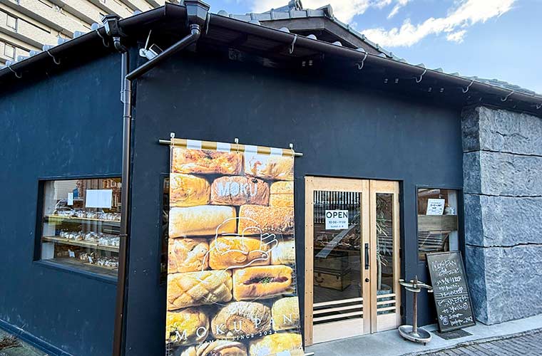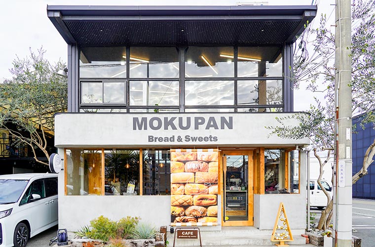 2号店である「下寺店」は、JR京口駅から徒歩7分ほどの場所にあります。ネイビーの外壁に「MOKUPAN」という大きな英字のオブジェが目を引くので、訪れたことがない人でもすぐに場所がわかるような立地です。駐車可能台数も多く、電車でも車でもアクセスしやすいのがうれしいポイント。日常使いはもちろん、立ち寄りやすさも魅力の一つです。