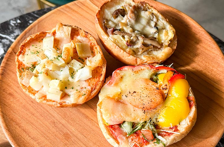 手のひらサイズの食パンに並ぶ、同店のもう一つの目玉商品が“おかずパン”。その名の通り、パンの上にたっぷりと野菜やチーズなどの具材をのせて焼き上げた、おかずになるパンです。ラインアップは常時5~6種類ほど。今後は季節野菜を使った限定メニューも登場する予定だそう。