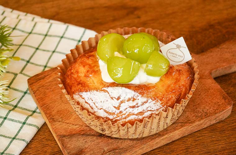 季節のフルーツが主役のデニッシュにも注目。9月のはじめから、みずみずしいシャインマスカットを使ったデニッシュが登場。サクサクとしたデニッシュの中には、優しい味わいのカスタードとスッキリとした甘さのヨーグルトクリームが隠れていて、果実の甘みを引き立てます。