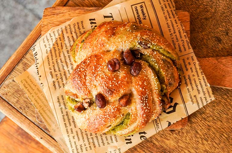 『ホワイトチョコマロン』と同じく、ライ麦生地を使用。玉露を混ぜ込んだ上品なあんこを大納言小豆と一緒に折り込んでいるので、どこを食べても玉露の香りが楽しめます。
