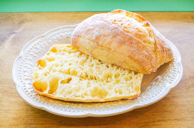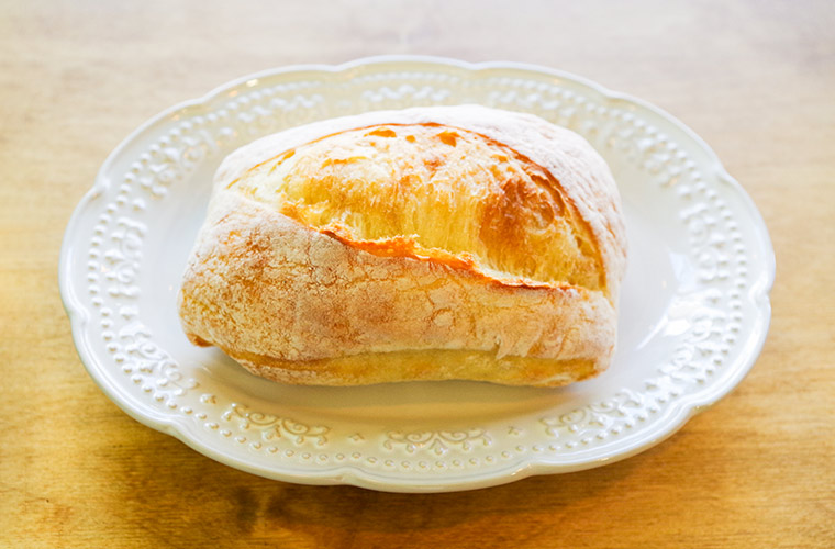 『チャバタ』は、北海道産「キタノカオリ」100%で作る高加水パン。ほんのり黄色がかった生地から立ち上る、甘い香りが特徴的です。