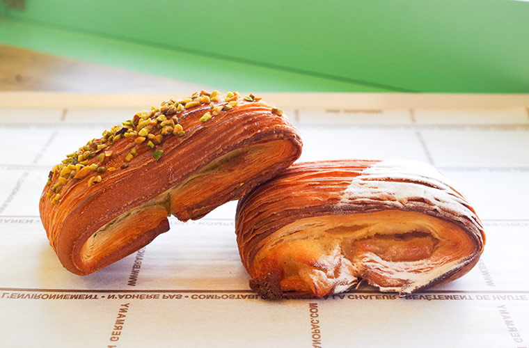 クロワッサン生地にクリームなどを挟んで焼き上げる「パンスイス」は、繊細に重なる層が見た目にも美しい一品。季節の素材を使う期間限定品で、取材日は、『りんごのパンスイス』と『くりとピスタチオのパンスイス』が並んでいました。