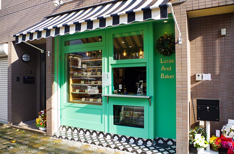 まず目を引くのは、まるで海外の洋菓子店のようなかわいらしい外観。「通りすがりの人でも気軽に立ち寄ってもらいたくて」と店主。ミントグリーンの壁に、白黒ツートーンのシェードやタイルを取り入れた遊び心のある装いに、道ゆく人も思わず足を止めてしまいそう。