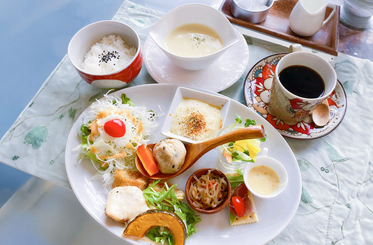 コンセプトは「生産者とお客様をつなぐ架け橋となりたい」。地産地消と手作りを心掛け、素材のおいしさを生かしたモーニングやランチ、オードブル、お弁当が自慢のカフェです。