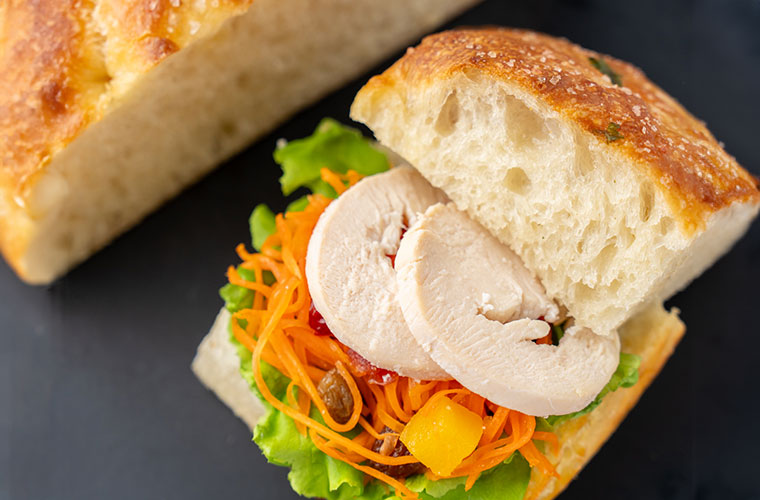 外は香ばしく中は驚くほどもちもちな「白神こだま酵母」の高加水フォカッチャも手作り。パンの間には、自家製キャロットラペとしっとりと仕上げた鶏ハムが挟まれています。食べ応え抜群の超もちもちフォカッチャサンドはベーカリーも顔負けかも!?