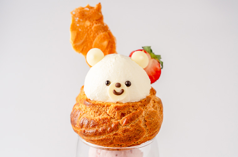 新年の“おいしい始まり”を飾る2026年1月のパフェは『Newyearくまくんプレート』。パフェのてっぺんには、にっこりと微笑むしろくまくんが!シュークリームの中には、ディプロマットクリームがたっぷりと入っています。さらに、その中にはイチゴを丸ごと一粒クレームシャンティで優しく包んだ甘~い罠も。ちょこんとのせたアーモンドチュイールもポイントです。