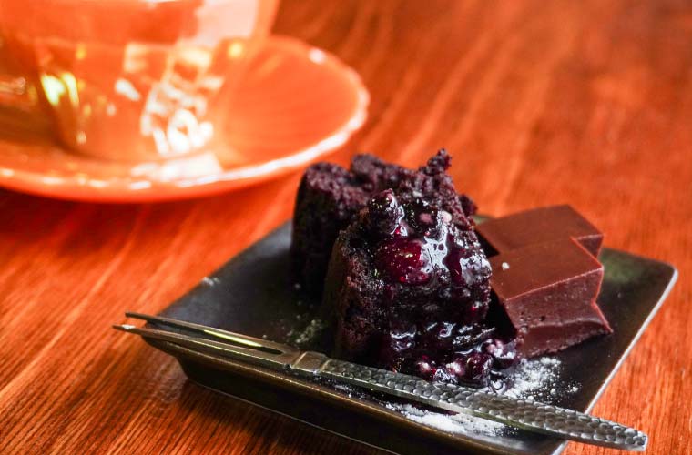 『米粉と酒粕のガトーショコラ』は、ビターなチョコレートの風味に、酒粕の爽やかな香りが重なる大人の味わい。濃厚ながら食感はふんわり軽く、食後でもぺろりといただけます。自家製ブルーベリーとイチゴのジャムを添えれば、味わいに華やかなアクセントが加わります。
