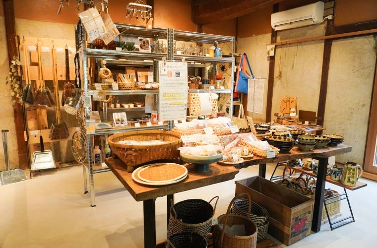 店主選りすぐりの道具や雑貨を販売する雑貨のアンテナショップも併設しています。竹ざるや木のまな板、自然素材で作られたホウキなど、昭和レトロなアイテムがずらり。