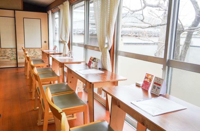 縁側には、2人掛けのテーブル席が4卓ほどスタンバイ。座敷で足を伸ばすのがつらい年配の人や、庭を眺めながらゆったりと食事を楽しみたい人に人気の席です。
