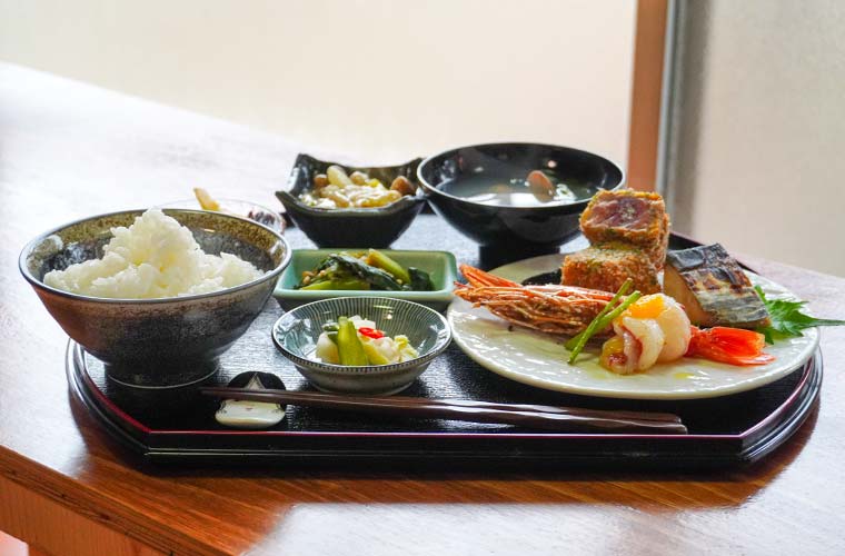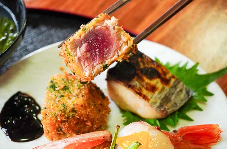 取材日の魚のメインは「3色海鮮盛り」。揚げ、焼き、漬けの3つの調理法で仕上げた海鮮を一皿に盛り込み、いずれにも麹を使った工夫が光ります。