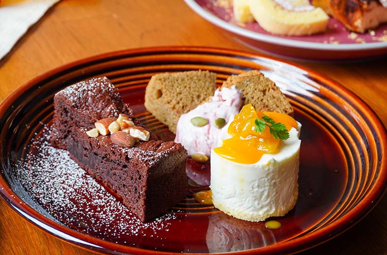 写真は「ガトーショコラ」「紅茶のシフォンケーキ」「ホワイトチョコのムース」の3種類。内容はその時々で変わるので、毎回新しい出合いに期待できそう。ときには季節のフルーツを使ったケーキのほか、テイクアウトで人気のマフィンやスコーンといった焼き菓子も登場します。