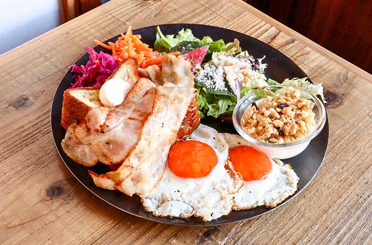 ベーコンの布団を被ったトーストの横には、こだわりのブランド卵で作った目玉焼きが2個とサラダ、自家製ラペ2種、ヨーグルトが添えられていて彩り満点!一日の元気をチャージしてくれるパワフルな一皿です。