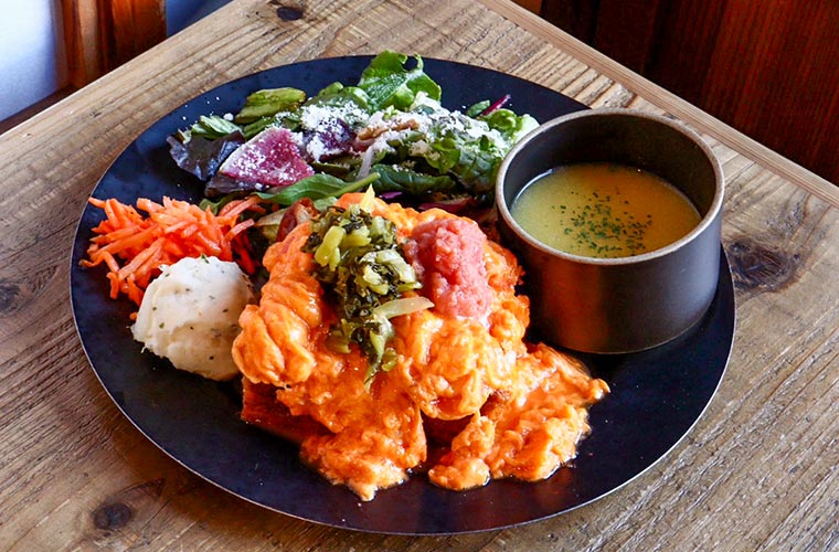 色鮮やかなスクランブルエッグに明太高菜を合わせた、意外性No.1のトーストランチにも注目です。ほどよい塩味と卵のまろやかな味わいが絶妙にマッチし、ひと口ごとに新鮮な驚きがあります。