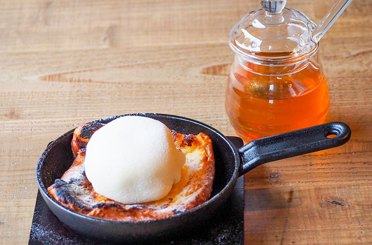 “パンエス”に来たら絶対に外せないスイーツが『鉄板フレンチトースト』!自慢の『ムートースト』を卵液にくぐらせ香ばしく焼き、その上に自家製のジェラートを求肥で包んだ大福を豪快にのせたフォトジェニックなオリジナルスイーツです。とろけるジェラートと甘いソースのハーモニーがたまりません♪