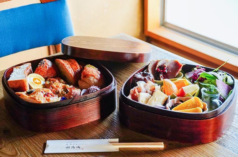 一の重には惣菜3種とサラダ、フルーツを、二の重には自家製パン6種にジャム、バター、あんこを詰めたスペシャルメニューが新たに登場。窓の外に広がる姫路城の堀や日本庭園を眺めながら、おせちを味わうような気分でゆったりと楽しめる、和の趣あふれる一品です。