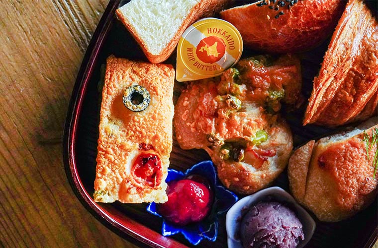 二の重のふたを開けると、お重の中には日替わりで用意される6種のパンがずらり。この日は、「ムー」「あんパン」「塩バタークロワッサン」「明太フランス」「枝豆ペペロンチーノのエピ」「オリーブとミニトマトのフォカッチャ」が並び、甘い系から食事系までまんべんなく楽しめる内容でした。一つひとつ丁寧に焼き上げられたパンは、それぞれ個性があり、それらをちょっとずつ味わえるのもこのお重の魅力です。