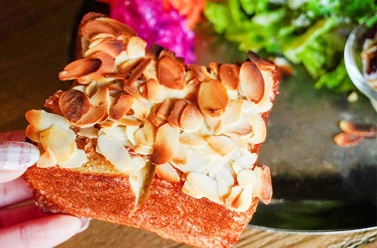姫路店限定の姫路名物「アーモンドトースト」も外せないところ。同店のパンを知り尽くした専任のブーランジェが、このパンに合うように開発したオリジナルレシピで、アーモンドバターを手作りしています。