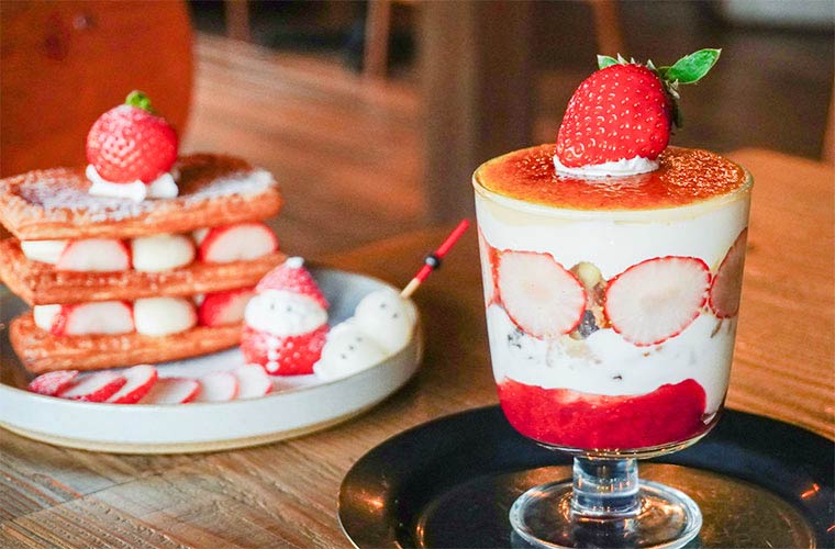 その時々で季節限定メニューも登場するので要チェック!12月から春先にかけては、旬のイチゴを使ったかわいらしいスイーツがお目見え♪第一弾(12月6日~2月5日)は、クロワッサン生地を使った『いちごのデニッシュミルフィーユ』や、自家製ピスタチオジェラート入りの『いちごのパフェ』など。