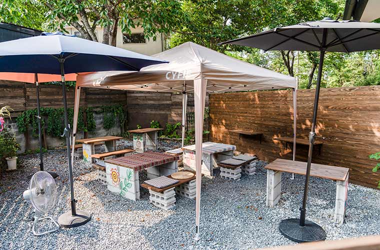 4人掛けのテーブルが5卓設けられたテラスは、ペット同伴で利用することができます。(※リード必須&店内の往来はNG)。東条の自然の音が聞こえる場所で思わず、時間が過ぎていることを忘れてしまいそう。