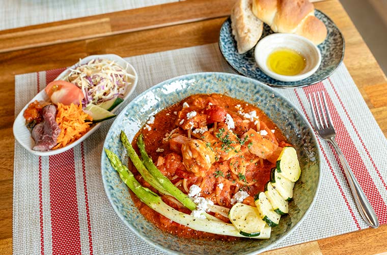 スパイスがほんのり香るトマトソースに、ぷりぷりの海老を合わせた逸品。丁寧に焼かれたズッキーニとアスパラには野菜本来の甘さがギュッと詰まっています。中太麺で食べ応えもしっかり。国産野菜にこだわった優しい味わいと魚介が香るトマトソースをご賞味あれ♪