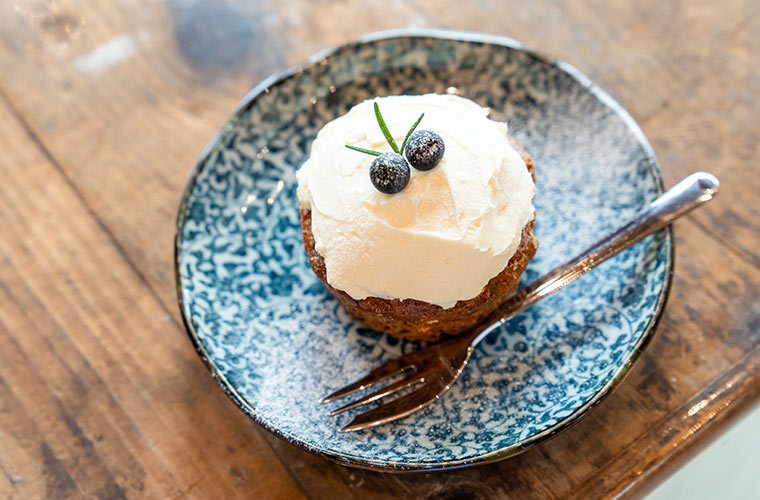 マルシェ時代からの人気の『キャロットケーキ』。クルミ、ラムレーズン、カボチャの種、スパイスたっぷりの生地はふんわりと香りが立ち、トップのクリームチーズは甘さ控えめ。おやつにも、カフェタイムにもぴったりです。