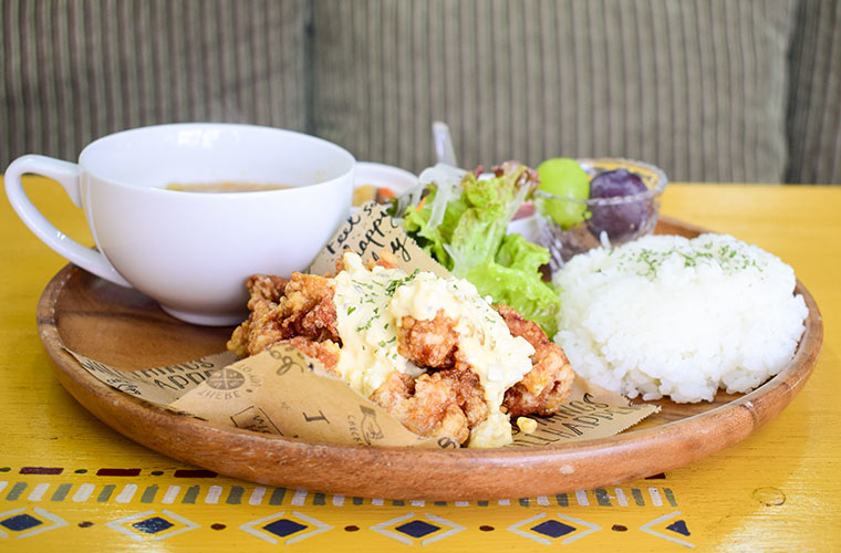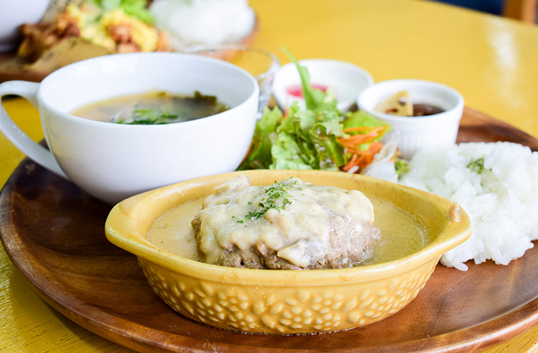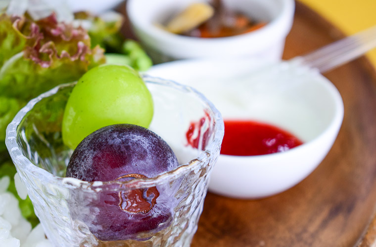 プレートには、野菜たっぷりのスープやサラダ、季節のフルーツ、副菜が付き、ボリュームも満点です。ご飯には赤穂産のお米を使用するなど、地元食材を大切にしています。しかも今なら秋のご馳走、新米が食べられるチャンス。もっちり甘い新米を堪能して。