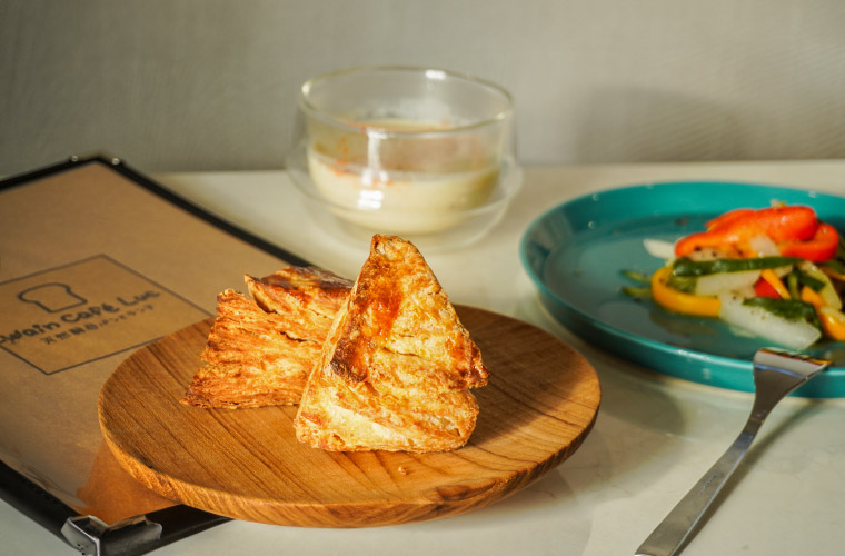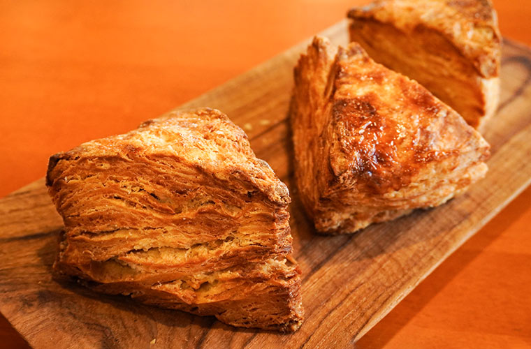 「よつ葉バター」を惜しみなく使い、数日間寝かせてうま味を引き出した生地を丁寧に、かつ均一な厚みになるよう折り込むことで生み出される美しい層にも注目を。食べる前にオーブントースターで軽く焼き直すことで、焼き立てのような食感と香ばしさ、そして芳醇なバターの香りが蘇ります。