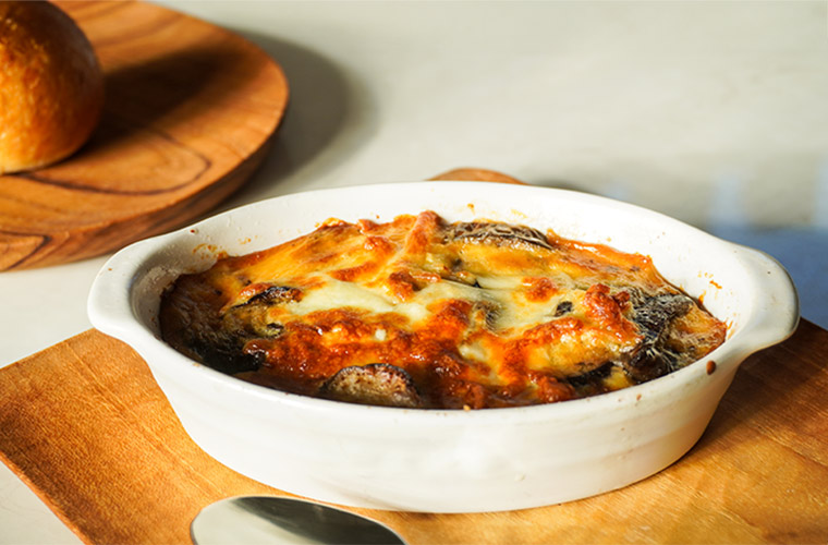 タルト生地を使わない「秋ナスと生ハムのキッシュ“風”」は、ジューシーな秋ナスと、ほどよい塩味の生ハムを重ね、生クリームを使用したコクのある卵液でじっくりと浸した一品。なめらかな卵液と秋ナスの甘み、生ハムの塩気が絶妙に調和し、食べるたびに深い味わいが広がります。