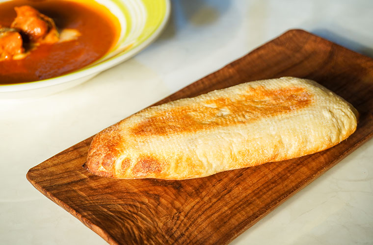 「バターチキンカレーには、このナンが相性ばっちりなんです」と店主。タンドール窯で焼く一般的なナンとは違い、同店のナンは天然酵母生地を使い、外はカリッと、中はもっちりとした食感が特徴です。仕込み水をヨーグルトに置き換えることで、カレーの辛さを引き締めるようなほのかな酸味と、乳酸菌特有のうま味が加わり、カレーとの絶妙にマッチ!