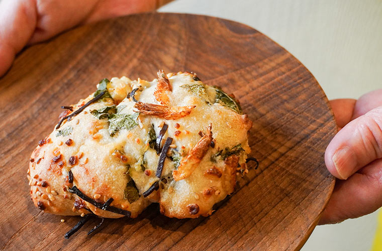 駿河湾産の天日干し桜エビに、大葉と塩昆布をたっぷりと練り込んだ一品。袋を開けた瞬間、ふわりと広がる香ばしいエビの香りが食欲をそそる、絶妙な塩味の“おつまみパン”で、お酒との相性も抜群です。