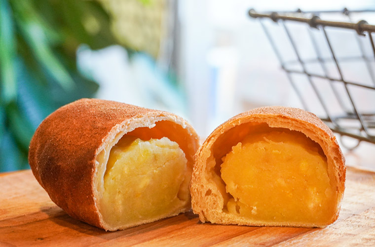 焼き芋さながらの見た目と、ずっしりとした重み・ボリューム感に思わず目を引く『焼き芋風パン』。蒸したサツマイモに砂糖とバターを加えて練り上げた“自家製芋あん”を生地で包んだこだわりの一品です。仕上げには、控えめながらも香り高い「セイロンシナモン」をたっぷりと。素朴な甘さの中にほんのりと異国のエッセンスと、なによりも店主のセンスが光っています。