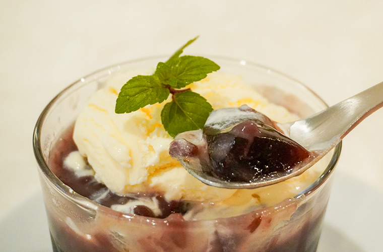 この『珈琲ぜんざい』に使うのは、店主の出身地・徳島県の「aalto coffee(アアルトコーヒー)」の豆。思い入れの深いコーヒー豆を丁寧に抽出し、ゼリーに仕立てています。その上にあんことバニラアイスを重ねれば完成。コーヒーのほろ苦さとあんこの優しい甘み、アイスのミルキーなコクが口の中でとろけ合う、至福のひと品です。