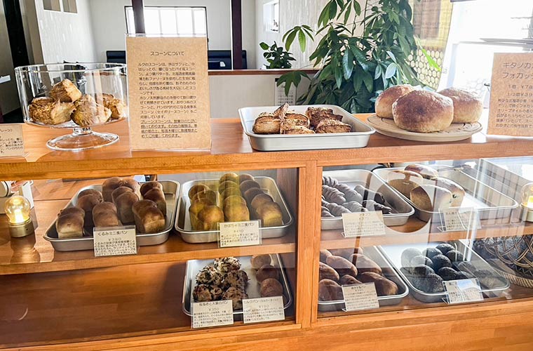 ショーケースには、毎日7〜10種類ほどのパンがずらり。ミニサイズの食パンや菓子パン、個性あふれる総菜パン、分厚いスコーンなど、どれも魅力たっぷりのラインアップです。もちろんすべてが天然酵母仕込みなので、一日に作れる数はわずか。気になるパンは早めのチェックがおすすめです。