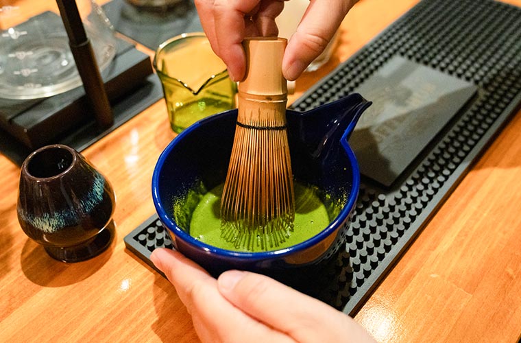 提供の際には、抹茶を自分でシャカシャカと点ててから注ぐ体験型のラテ。自ら注ぐ、濃い緑の抹茶がミルクと混ざり合い、じんわりと広がるマーブル模様は見ているだけでもうっとりします。大人から子どもまで、点て方を学びながら茶せんの音や香りを楽しめる特別な一杯です。