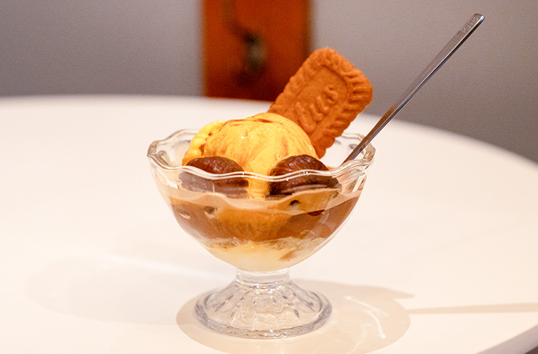 浅煎りのエチオピアのエスプレッソを使用した『季節のアフォガード』。季節によってトッピングされる食材が変わり、取材時は自家製安納イモのアイスがオン。エスプレッソのほろ苦さとアイスの甘みが絶妙にマッチします。一番下のコーヒーゼリーまで混ぜて味わえば、最後の一口まで楽しいスイーツの完成です。味変しながらゆっくり味わって。