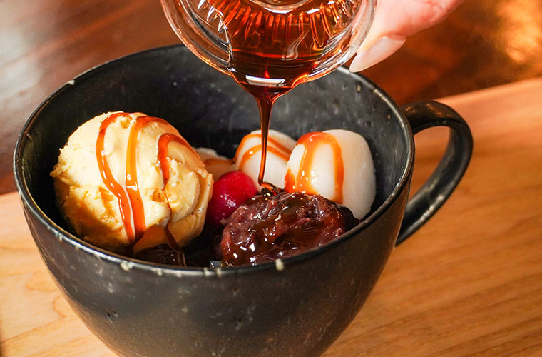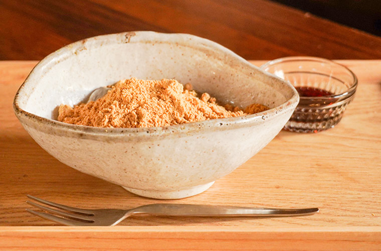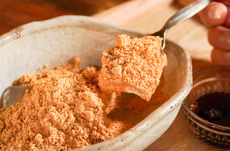 透明で、うっとりするほど美しいわらび餅には和三盆を使用。和三盆ならではの上品な甘みが、きな粉や、お好みでかける黒蜜の甘さと絶妙に調和します。