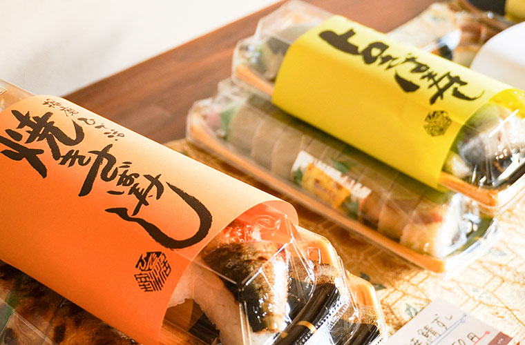 イートインでは自慢のサバ寿司を終日注文できるセットメニューを、テイクアウトでは1本単位で販売しています。