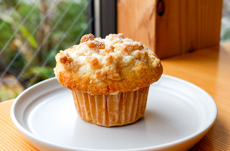 マフィンは常時2種類で販売していて、どんな種類が店頭に並ぶかは当日のお楽しみ。この日提供されていた一つは『クリームチーズマフィン』。サクサクのクランブルがたっぷりとのっていて、中にはクリームチーズがたっぷり!クランブルの食感と生地の優しい甘みに、クリームチーズの塩気がマッチしています。一口食べると手が止まらなくなるおいしさです。