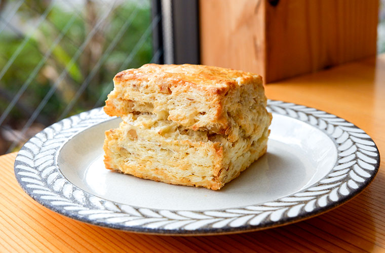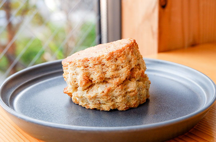 全粒粉などを使った香ばしい風味が生かされたスイーツが好きだという店主。そんな店主が手がけた『全粒粉スコーン』はその言葉通り、小麦粉やバターの香りが際立つ一品になっています。この風味を生み出す秘密が石うすで粗めに挽(ひ)かれた全粒粉の使用と、バターの余韻を残す独自の混ぜ方にあります。「ゲランドの塩」も良いアクセントに。