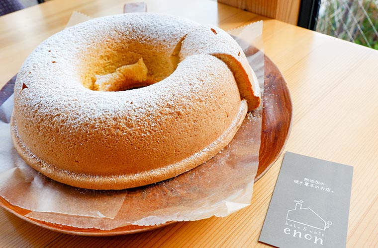 料理上手な店主の叔母のレシピで作られる思い出の味。何気なく出してくれた焼きたてのこのケーキを食べたときにとても感動を覚え、店主の手によって再現されました。ケーキは、“人と人との縁”をイメージした、丸くて途切れのないリング型。一つのケーキをみんなで分け合って食べるスタイルが、“縁”と“恩”を大切にする同店の想いにぴったりと重なり、店名を冠した『enonケーキ』と名付けられたそうです。