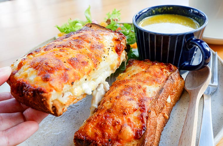 同市内にある「BAKELY Couleur(ベーカリークロレ)」の食パンに、こぼれそうなほどたっぷりのベシャメルソースと自家製ハムが合わさったクロックムッシュは絶品。チーズとベシャメルソースのコクの相性が抜群で、そこに自家製ハムのほどよい塩味とうま味が加わり、満足度をさらに上げてくれます。食パンは耳までやわらかく香ばしいので、熱々なのにぱくぱくと食べ進めてしまいます。