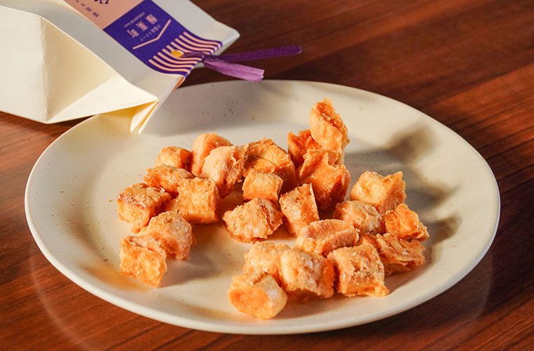 醤油を加えることでコク深く仕上げた砂糖で、麩をキャラメリゼした新感覚のスイーツも。口に入れた瞬間はシャリッと軽やかで、そのあとすっと溶けるようにほどけていきます。そこへ「赤こいくち」のうま味がふわりと重なり、つい手が止まらなくなるおいしさです。