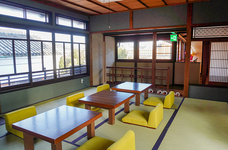 2階には、テーブル席・座敷席・カウンター席があり、それぞれ3つの区画に分かれて用意されています。どの席を選んでも格子窓の向こうには、たつののトレードマークともいえる「ヒガシマル醤油」の工場が望めるのも、この立地ならでは。城下町の風情に浸りながら、癒やしのひとときを過ごせます。