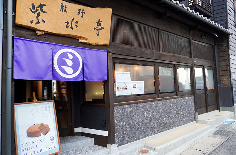 白壁の町家が並ぶ龍野城下町。この町のメインストリート「龍野橋」前の大通り沿いに、醤油をコンセプトにした和カフェ「龍野紫水亭(たつのしすいてい)」が2025年12月3日に誕生しました。歴史を感じさせる焼き杉の建具に、青紫色の暖簾が目印。達筆で書かれた看板からも趣が漂い、まるで50年、100年前からそこに静かに佇んでいたかのようです。