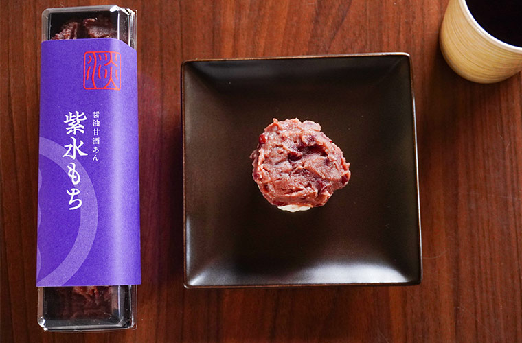 砂糖の代わりに甘酒を使った“醤油甘酒あん”と、もち米から作った和菓子「紫水もち」もおすすめ。だし醤油で優しい甘みに仕上げた醤油あんこに、うるち米をブレンドした上品なもち生地、さらに下には大葉のアクセントも忍ばせています。