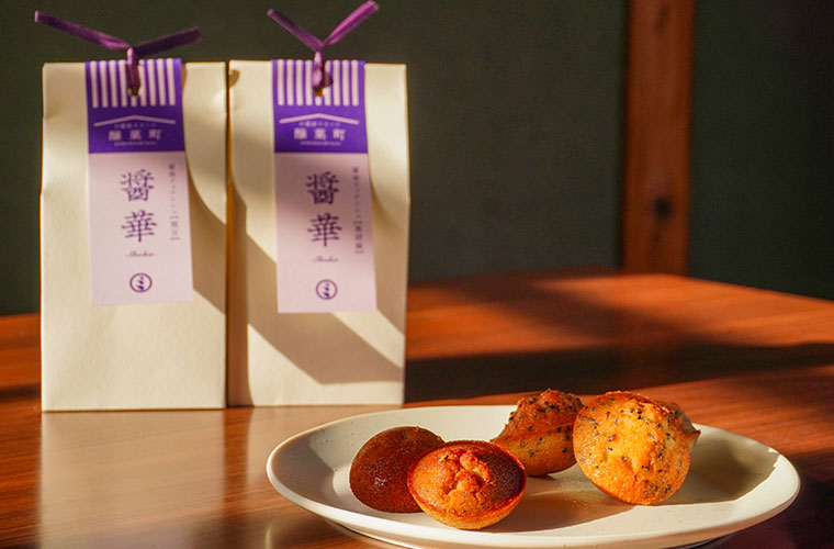 同店には、醤油を使った生ケーキのほか、焼き菓子「醸菓町(じょうかまち)シリーズ」もそろいます。ラインアップは、『醤華 醤油フィナンシェ【黒豆】』『醤華 醤油フィナンシェ【黒胡麻】』『醤賛 醤油クッキー【米粉 和三盆】』『醤酒 醤油キャラメリゼ【麩】』。おせんべいのような従来の“醤油菓子”のイメージを覆す、洋菓子のエッセンスを取り入れた焼き菓子が並びます。