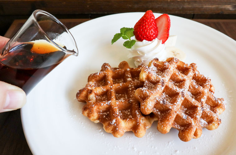 その名の通りサクッと軽い食感が楽しめるワッフルは、味変しながら食べる楽しさも!メープルシロップをかけるとトロッと濃厚な甘さに、クリームを付けるとなめらかな食べ心地に。イチゴやバナナも合わせて味の変化を楽しんでみて。