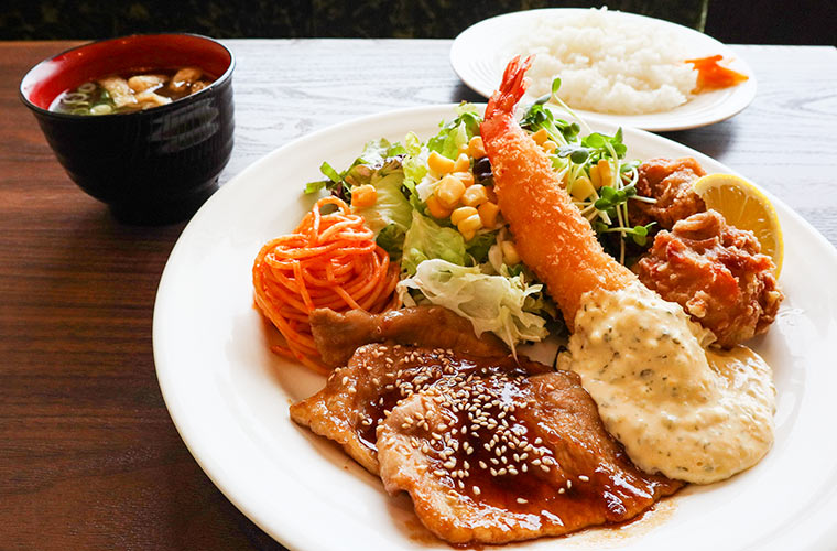 『豚の生姜焼きランチ』は、ほんのりショウガが香る優しい味わいの「豚のショウガ焼き」のほか、スパゲッティ、サラダ、醤油ベースの唐揚げと、一皿でさまざまな料理を楽しめます。存在感のあるエビフライにも注目を!プリッとしたエビの食感と、サッパリとしたタルタルソースが相性抜群です。