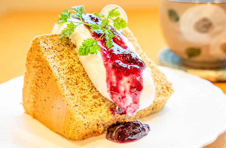 『シフォンケーキ』は、空気をたっぷり含んだふわふわの食感。フォークを入れるたびにやわらかく弾み、軽やかにほどけていきます。トッピングは、生クリーム、生クリーム + ブルーベリーソース、生クリーム + イチゴソースから選択可能。その日の気分で楽しめるのもうれしいですね。