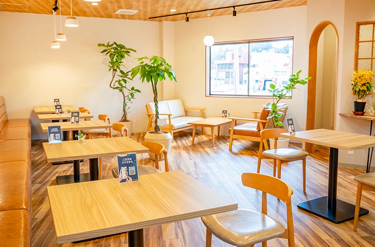 凛とした外観とは対照的に、扉の向こうはやわらかな空間が広がります。店内には穏やかな空気が流れ、気付けばゆっくりと長居してしまう人も少なくありません。木目の床と天井に包まれた店内には自然光が差し込み、ほっと肩の力が抜けるようなぬくもりに満ちています。